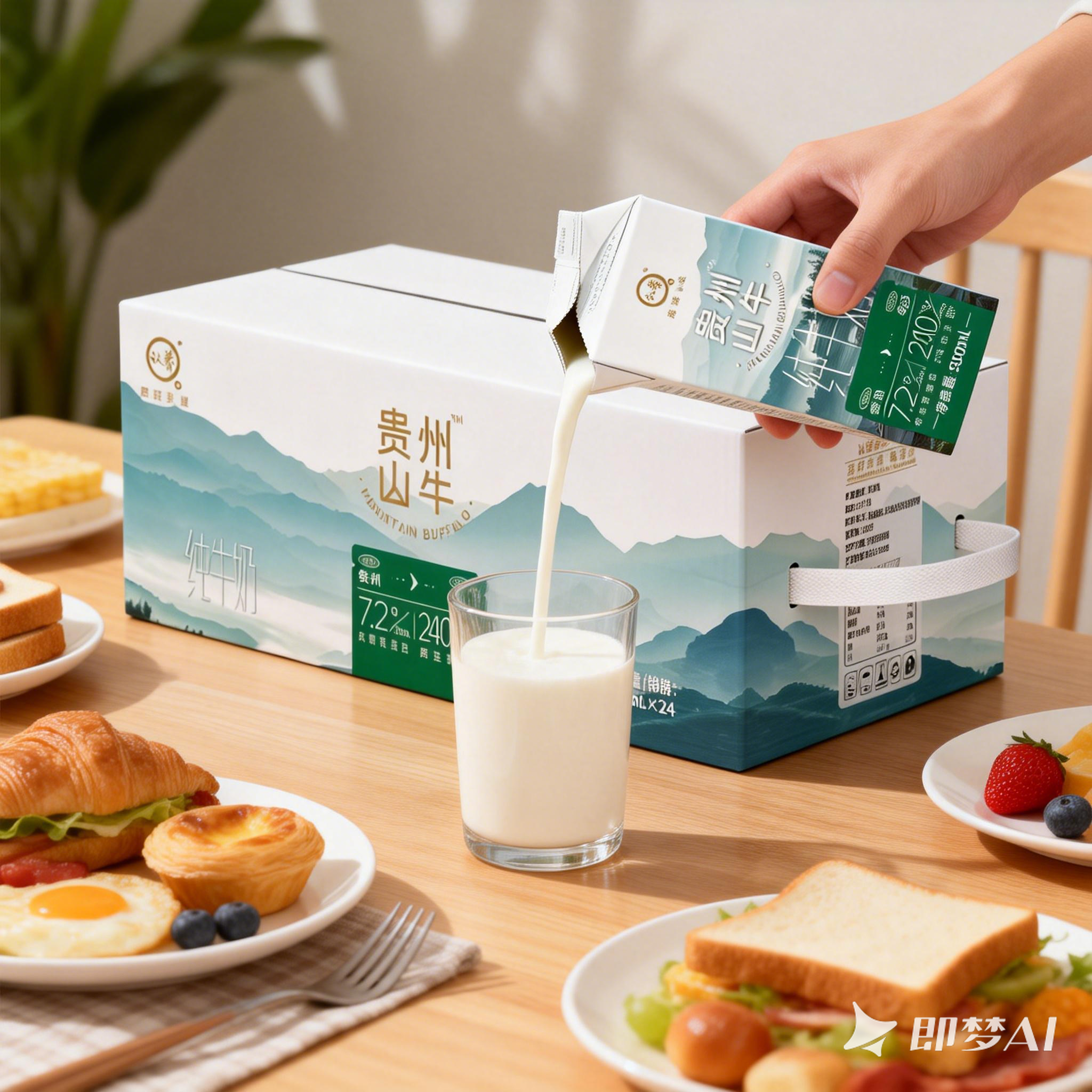 jimeng 2025 12 29 2475 背景是在一个餐桌上放着一箱牛奶周围摆着早餐,然后桌子上还放着一个玻璃杯,拿着一盒...