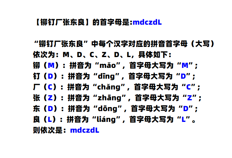 【铆钉厂张东良】的首字母是